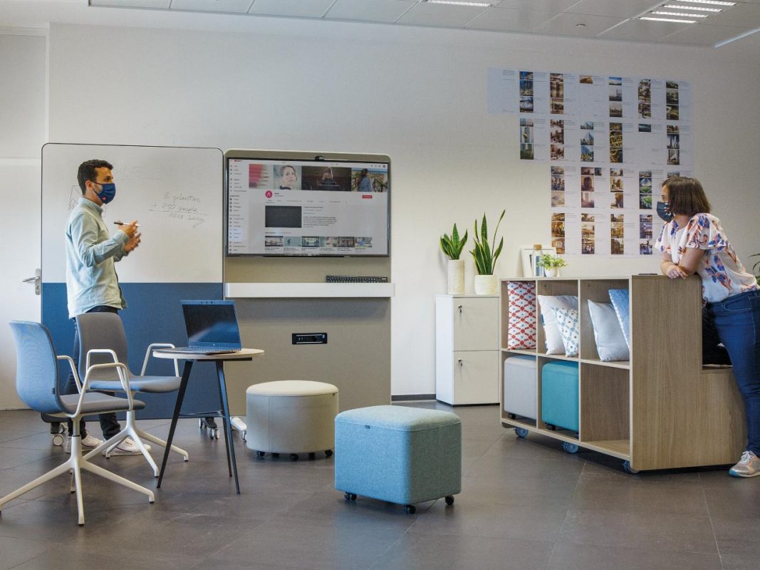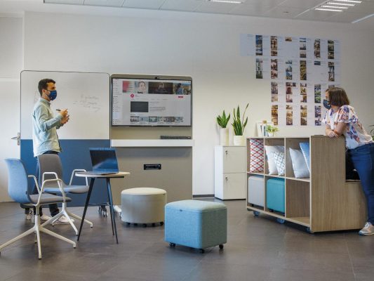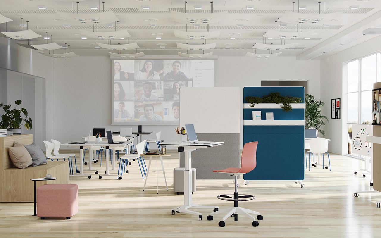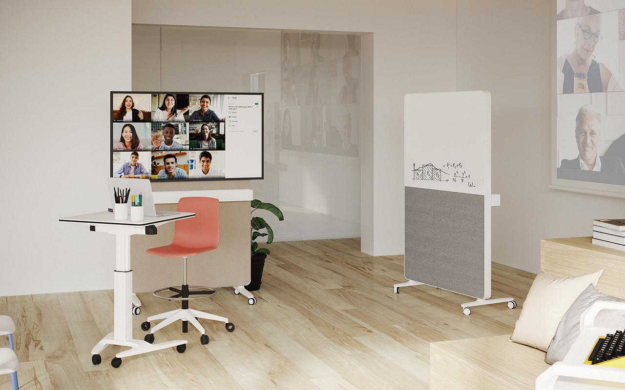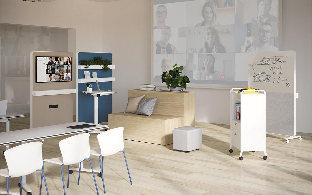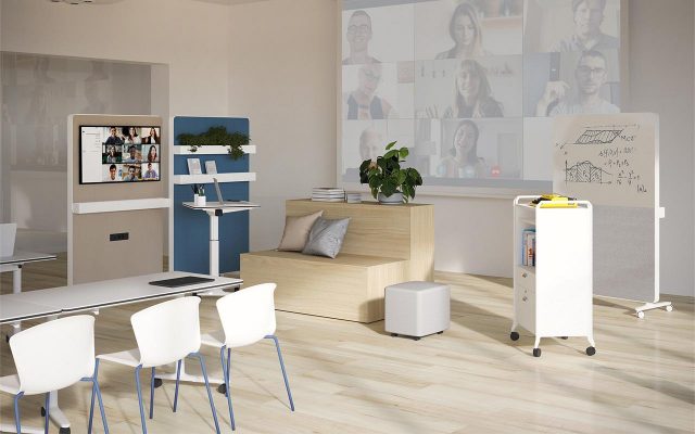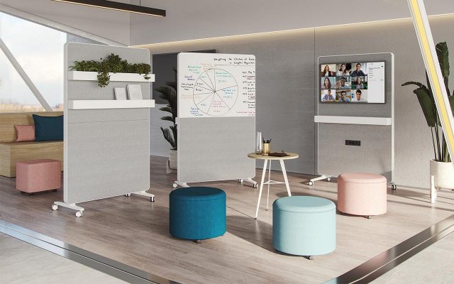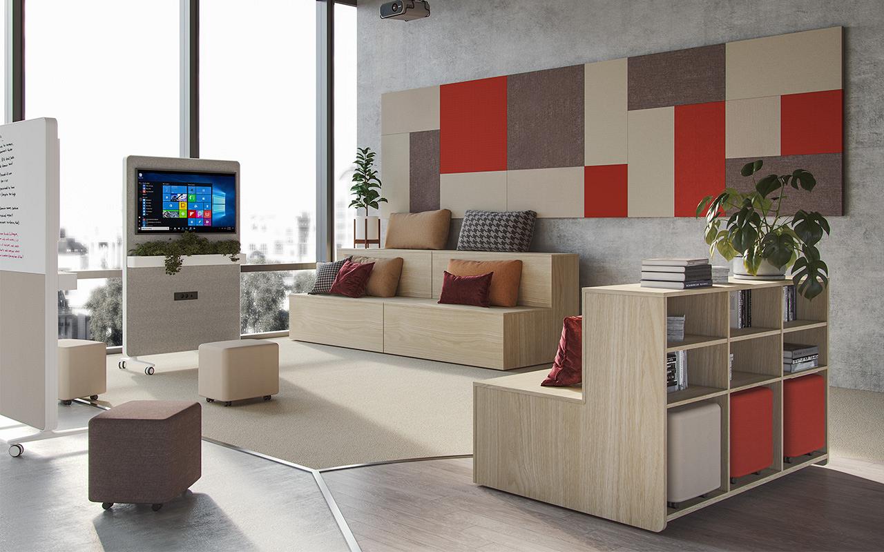 También disponemos de soportes móviles y ligeros que permiten crear distintos ambientes, pudiendo integrar pizarras y pantallas interactivas así como accesorios complementarios, su acabado tapizado favorece su cualidad fonoabsorbente y una mayor privacidad acústica.