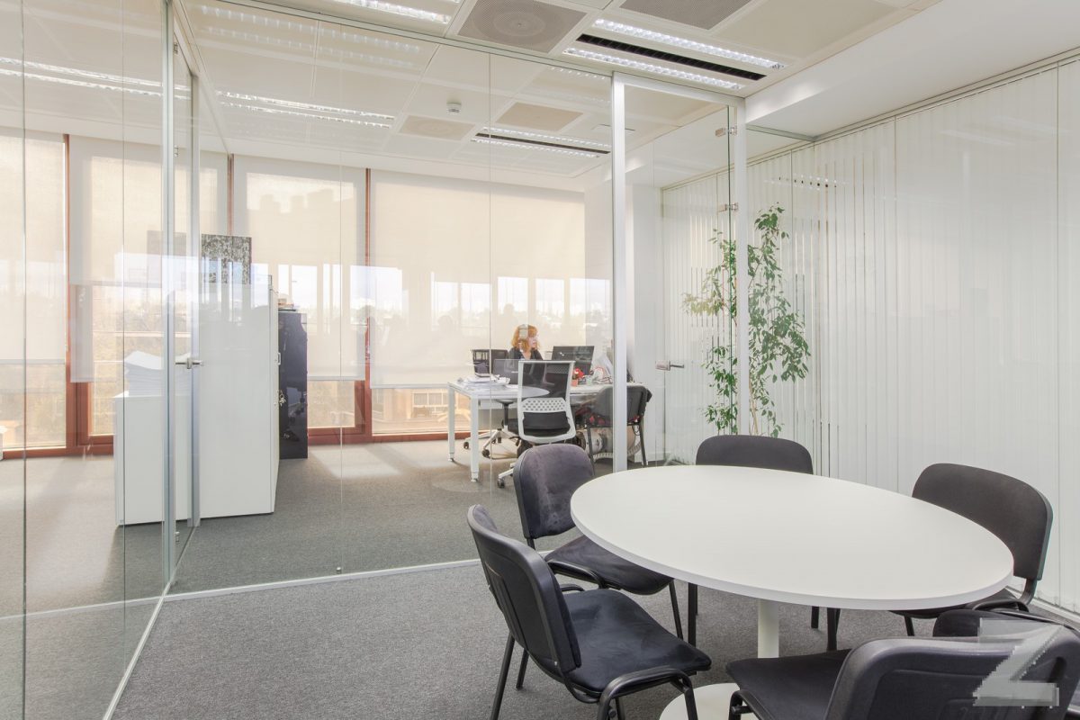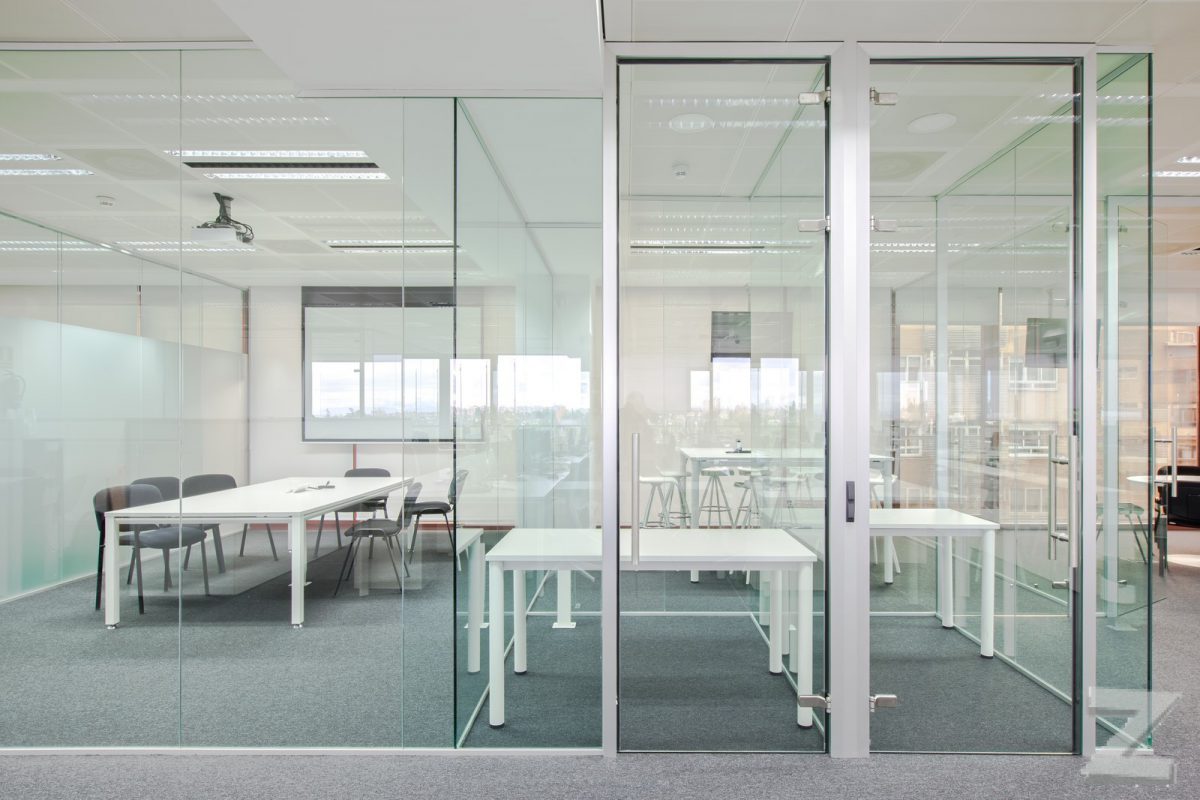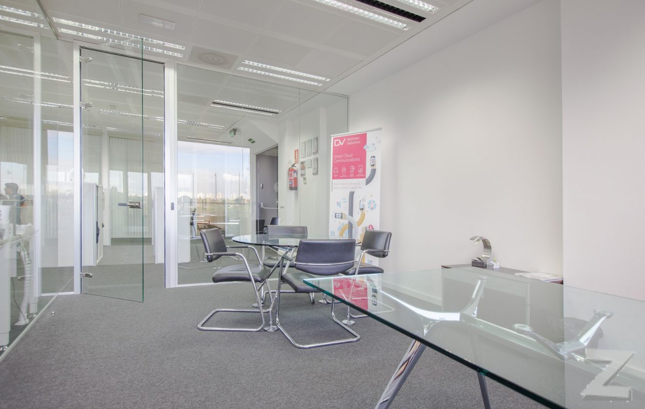 Mamparas de vidrio laminar simple, pavimentos de moqueta en oficina y pvc en zonas comunes, mobiliario funcional de Actiu y nueva red de voz y datos.